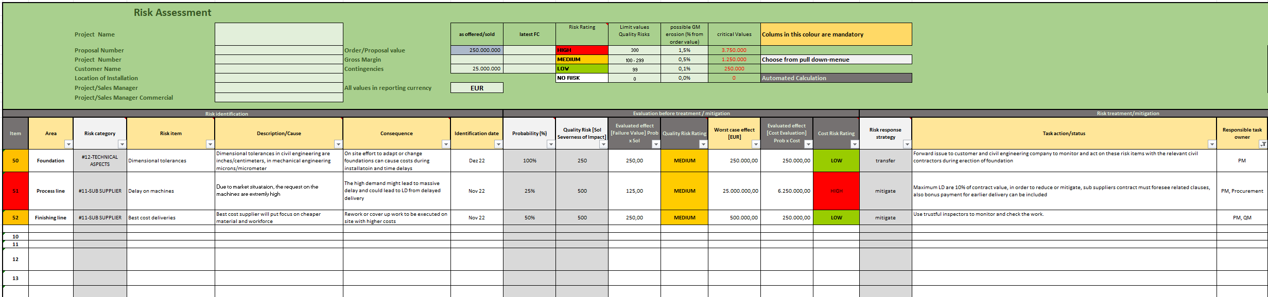 The main focus is on th Cost Evaluation of Risks, as they show the direct impact to the Gross Margin. The deviation on GM should always kept low if negative and high if positive, of course. Therefore Risk Management is on of the tools to identify them and find strategies to handle risks.